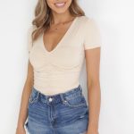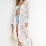 Beżowa Asymetryczna Narzutka Sukienka Maxi z Głębokim Dekoltem z Koronkowej Tkaniny Itzamara