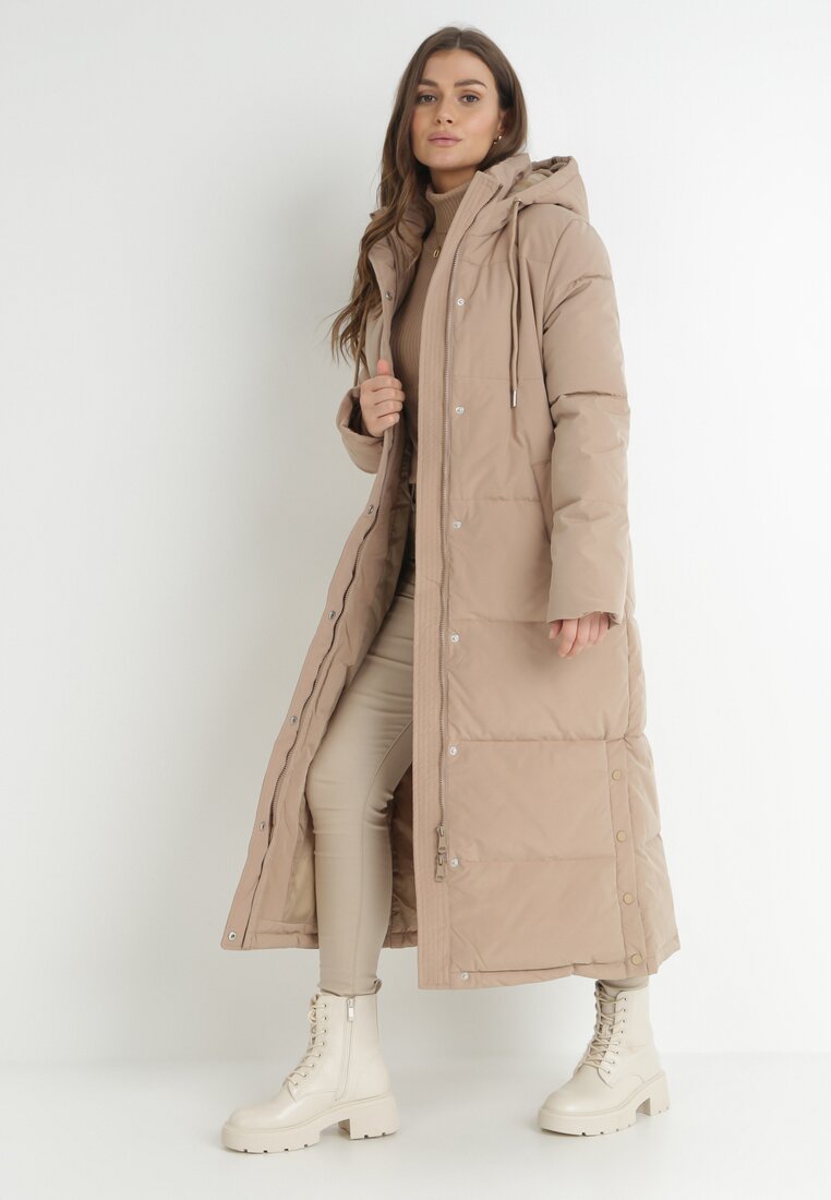 Beżowa Kurtka za Kolano Pikowana z Kapturem Talki