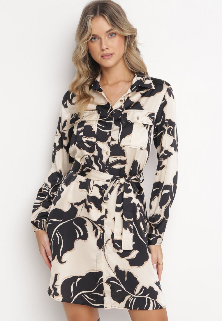Beżowa Sukienka Koszulowa w Kwiaty z Wiązanym Paskiem Rosava