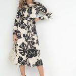 Beżowo-Czarna Koszulowa Sukienka na Guziki w Kwiaty Mivy