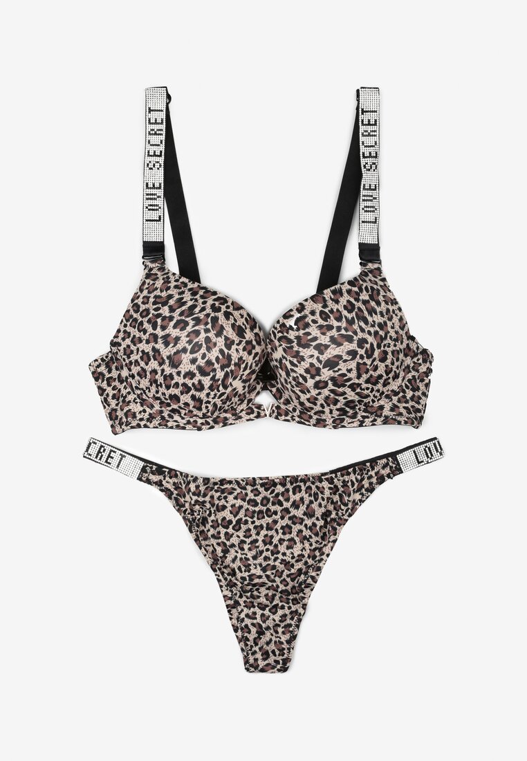 Beżowy Panterkowy 2-częściowy Komplet Bielizny z Dekoracyjnymi Paseczkami Siriosa