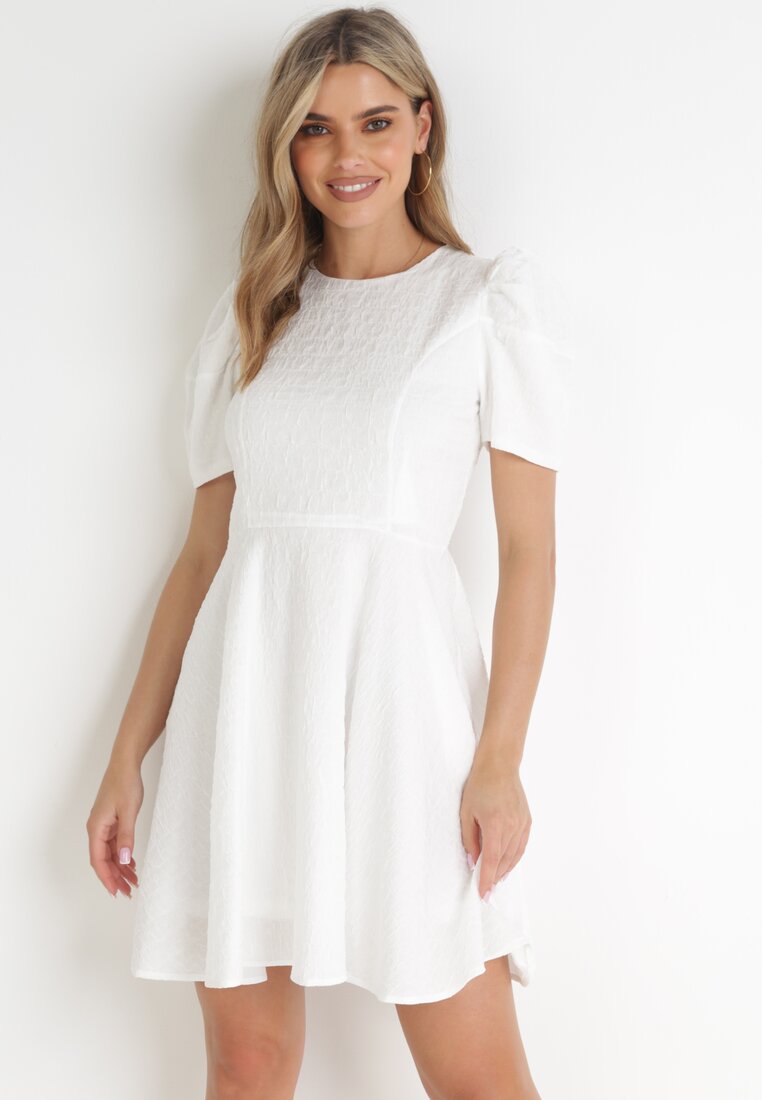 Biała Sukienka z Krótkim Bufiastym Rękawem Akazane