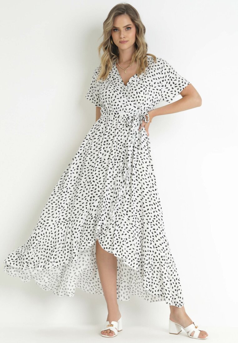 Biała Wiskozowa Sukienka w Kropki z Gumką w Talii i Wiązanym Paskiem Maiolaine