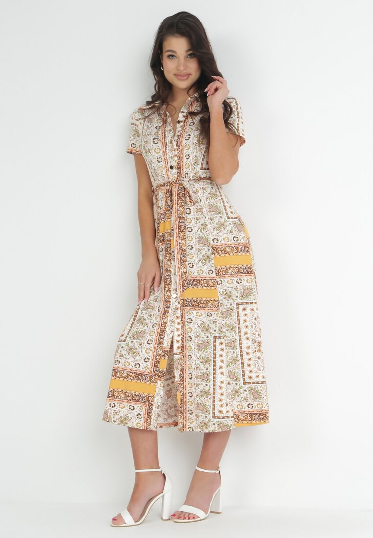 Biało-Żółta Koszulowa Sukienka Wzorzysta z Wiązanym Paskiem Titarissa