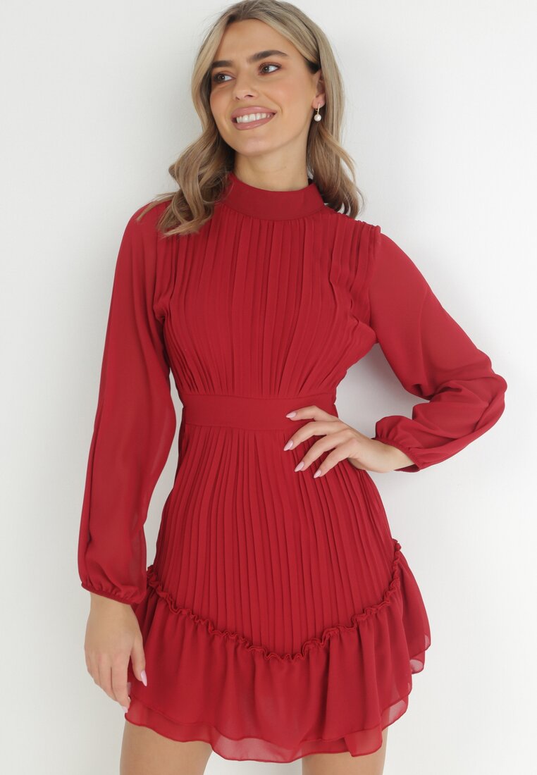 Bordowa Plisowana Sukienka Mini Rophe