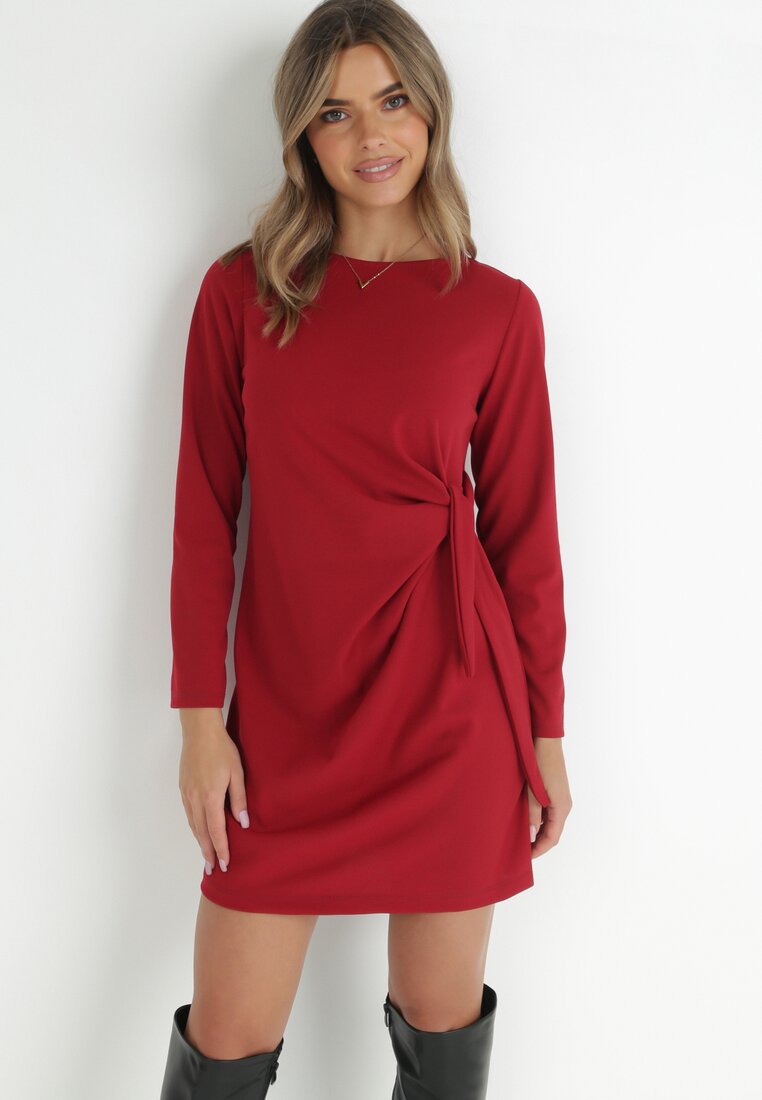 Bordowa Sukienka z Dekoracyjnym Wiązaniem z Boku Beki