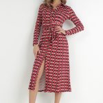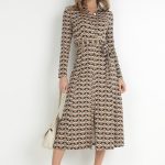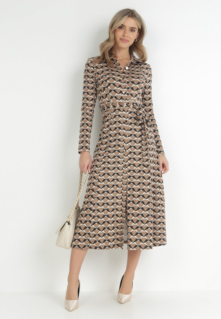 Ciemnobeżowa Sukienka Koszulowa z Wzorzystym Nadrukiem i Wiązanym Paskiem Laniran