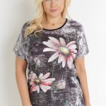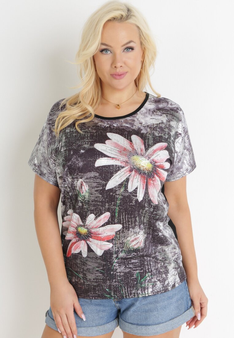 Czarna Bluzka Oversize z Metalicznym Nadrukiem w Kwiaty z Cyrkoniami Deqsa