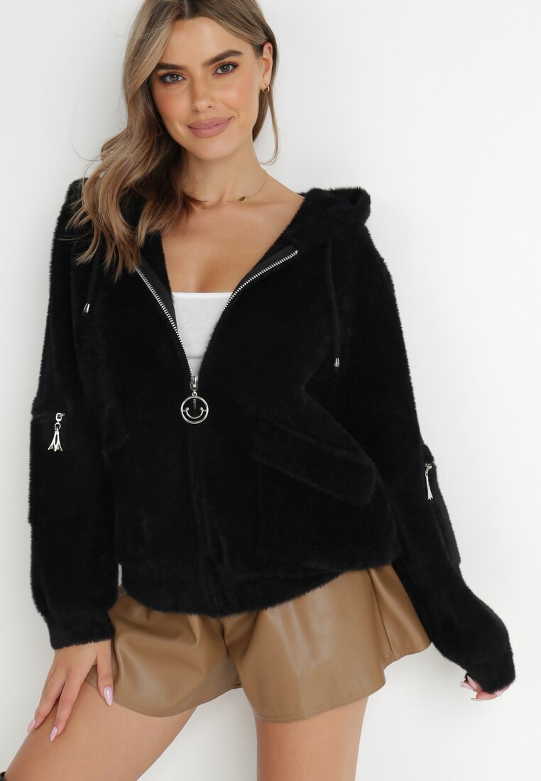Czarna Kurtka Alpaka Rozpinana z Kapturem Carette