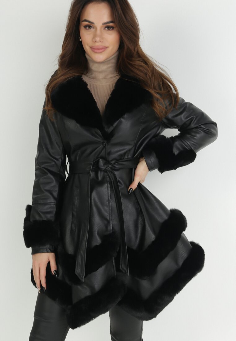 Czarna Taliowana Kurtka z Imitacji Skóry i Futerkiem Khemi