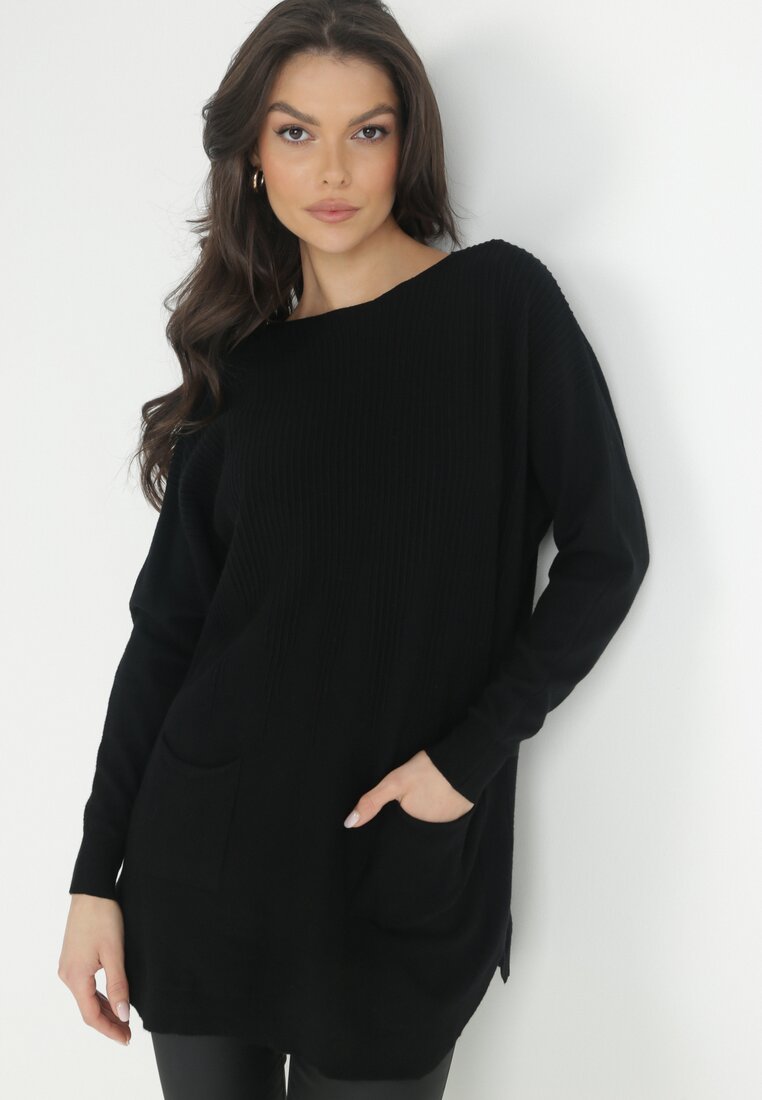 Czarny Długi Sweter z Kieszeniami Mauvi