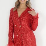 Czerwona Cekinowa Sukienka Marynarka z Piórkami na Rękawach Talmi