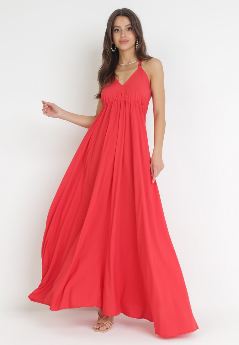 Czerwona Rozkloszowana Sukienka Maxi z Wiązaniem na Szyi Cathenia