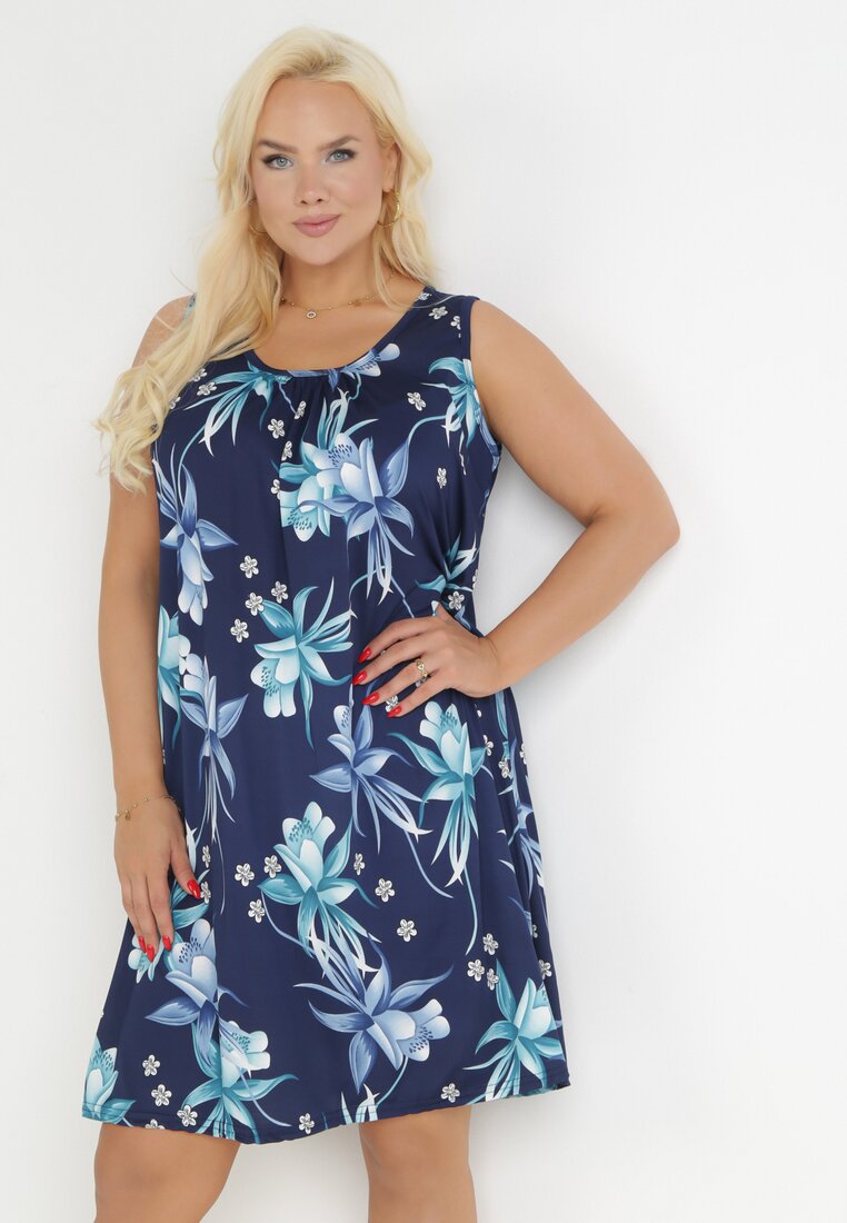 Granatowa Trapezowa Sukienka Midi z Marszczonym Dekoltem w Kwiaty Yanais