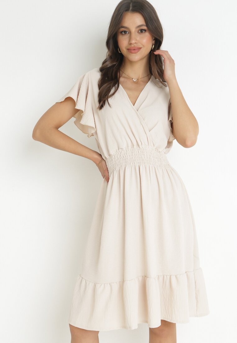 Jasnobeżowa Sukienka Mini z Gumką w Pasie i Falbanką Senait