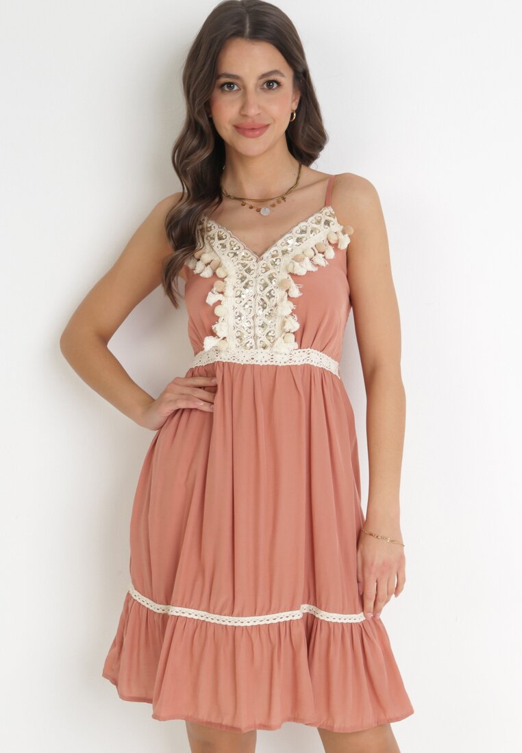 Jasnobrązowa Rozkloszowana Sukienka Mini na Cienkich Ramiączkach z Ozdobnym Dekoltem Skyle