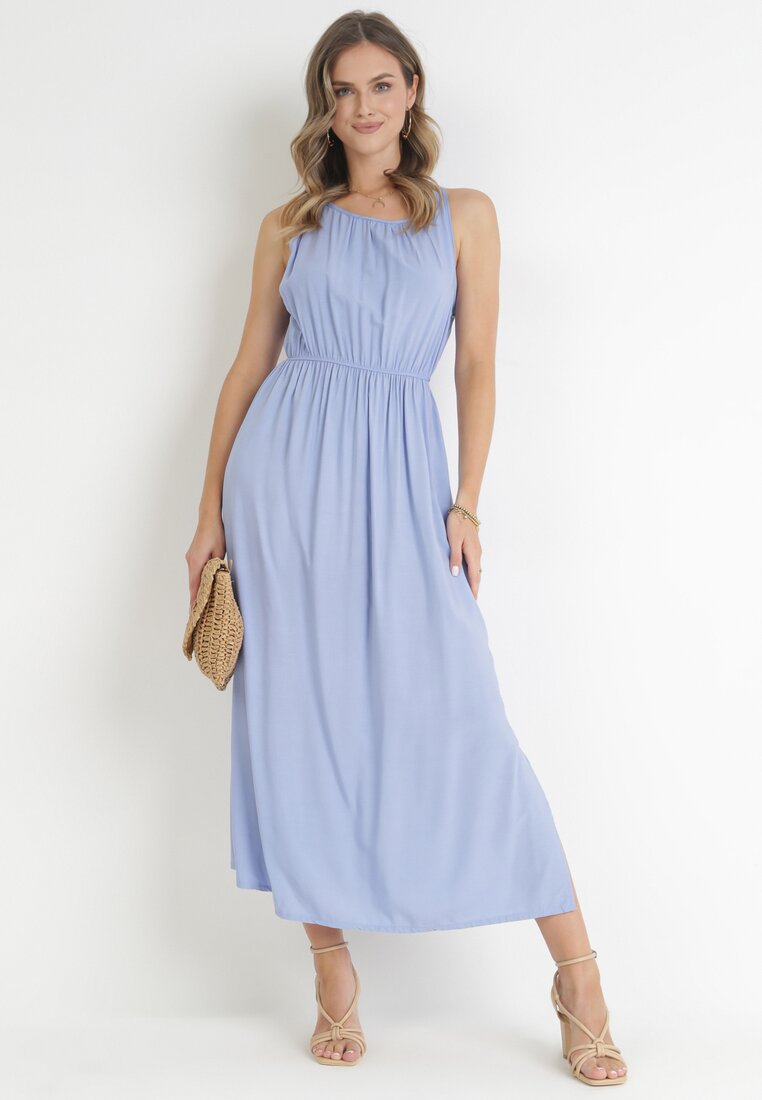 Jasnoniebieska Sukienka z Wiskozy Bez Rękawów z Gumką w Pasie Fona