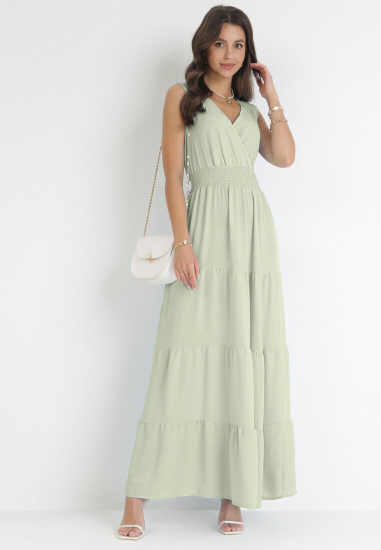 Jasnozielona Sukienka Maxi z Kopertowym Dekoltem i Gumką w Pasie Eiliana