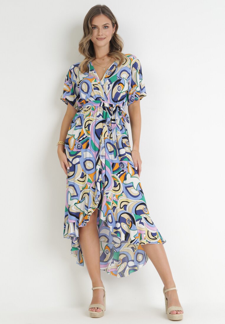 Niebieska Kopertowa Sukienka z Gumką w Pasie i Materiałowym Paskiem z Wiskozy Dionienne
