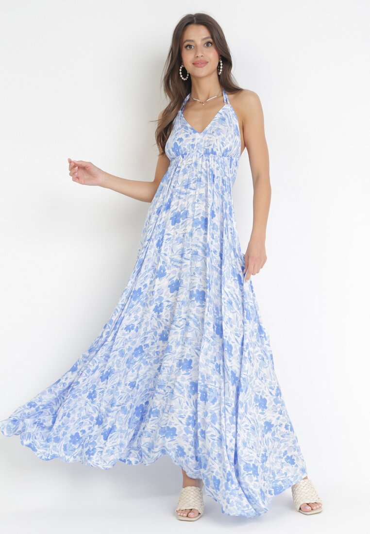 Niebieska Rozkloszowana Sukienka Maxi z Wiązaniem na Szyi Tesit