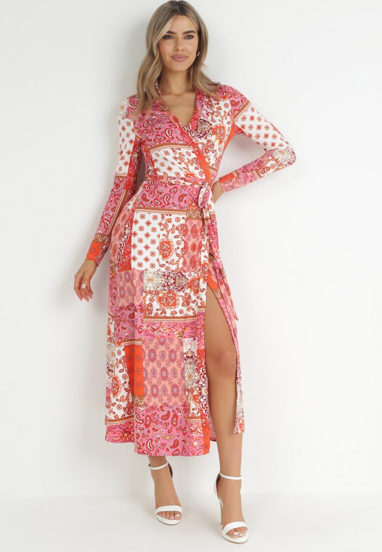 Różowa Kopertowa Sukienka Maxi z Wiązaniem w Pasie Maltore