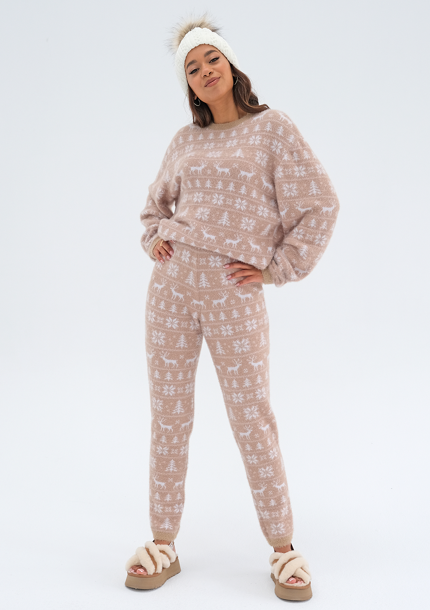 Snowee – Spodnie swetrowe w zimowy wzór Beżowe