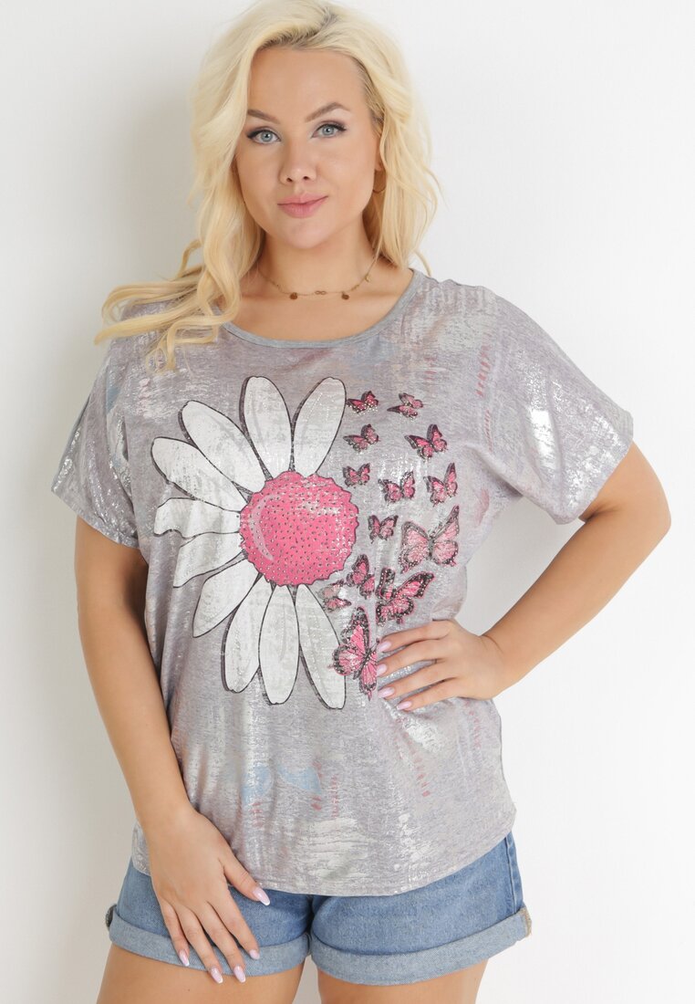 Szara Bluzka Oversize z Rękawami Nietoperz i Metalicznym Nadrukiem Idasa
