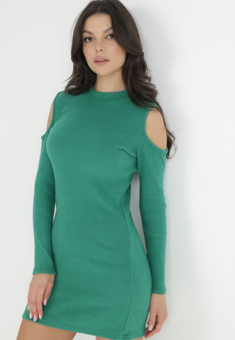 Zielona Sukienka Dzianinowa z Wycięciami na Ramionach Vathana