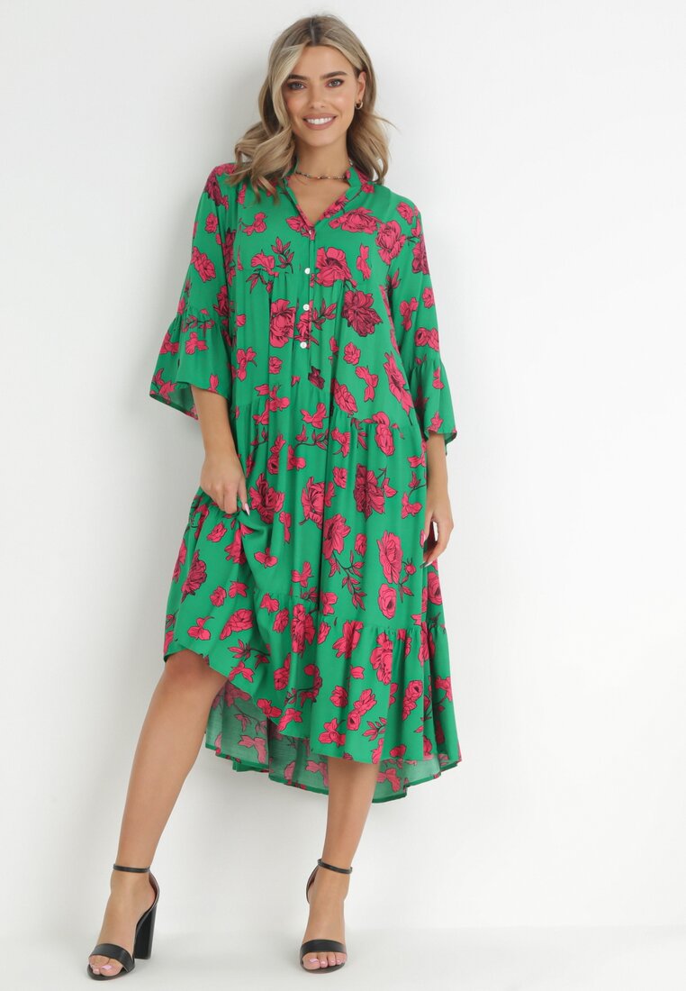 Zielona Sukienka Rozkloszowana z Falbankami Drirva